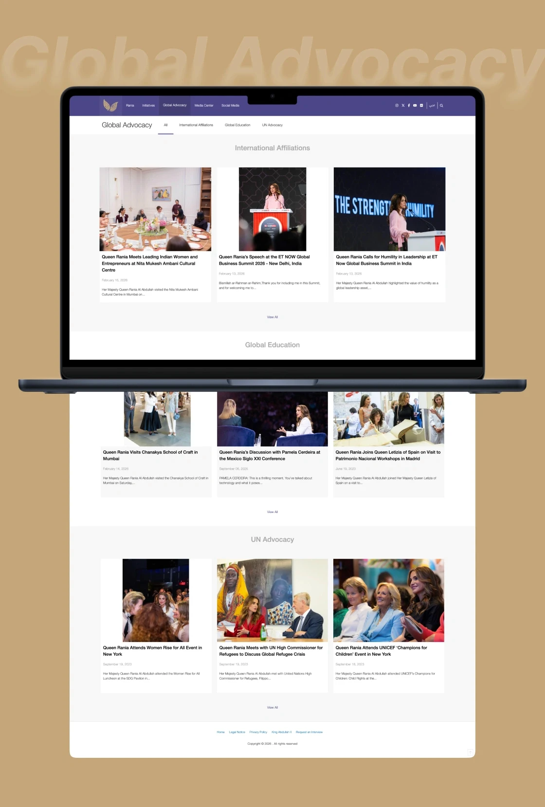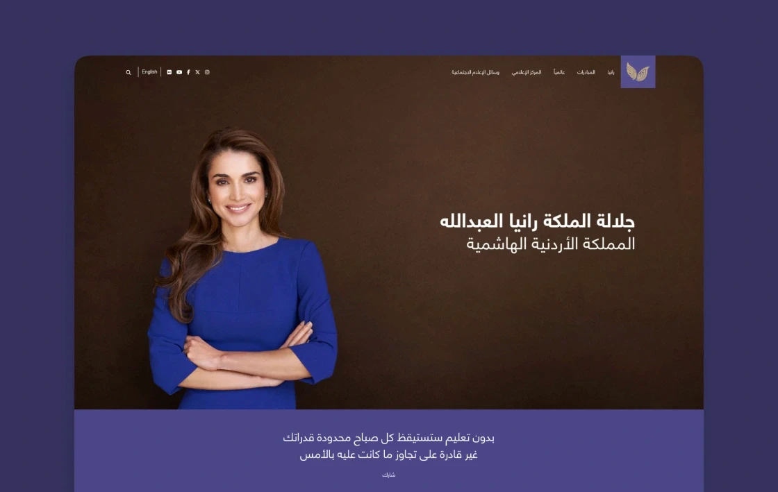 Working with VIP clients requires absolute precision and discretion. Her Majesty's office commissioned Plexable to design and develop QueenRania.jo, a comprehensive digital platform reflecting her role as a global advocate for education, cross-cultural dialogue, and social causes.